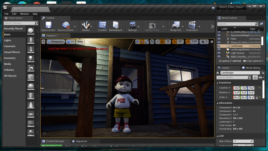 I am working on a short film about a little boy and his dream of flight. I’m animating it all alone. Creating locations, sets, props, set dressing. The boy I purchased from and mesh artist and I modified it for motion capture and key frame animation. I also gave him a better shirt!