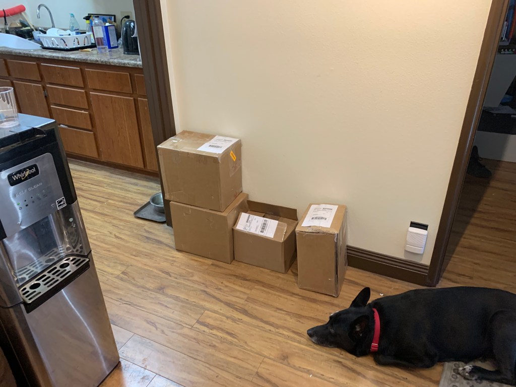 It’s hard to work on other projects I have like the crater lake monster sculpture when you have business to do first. Most of the orders are filled. Rosie sits in front of some of the orders ready to ship today. This in our galley room near the front door in the background you see our studio kitchen. We have been here so long it’s become our second home.