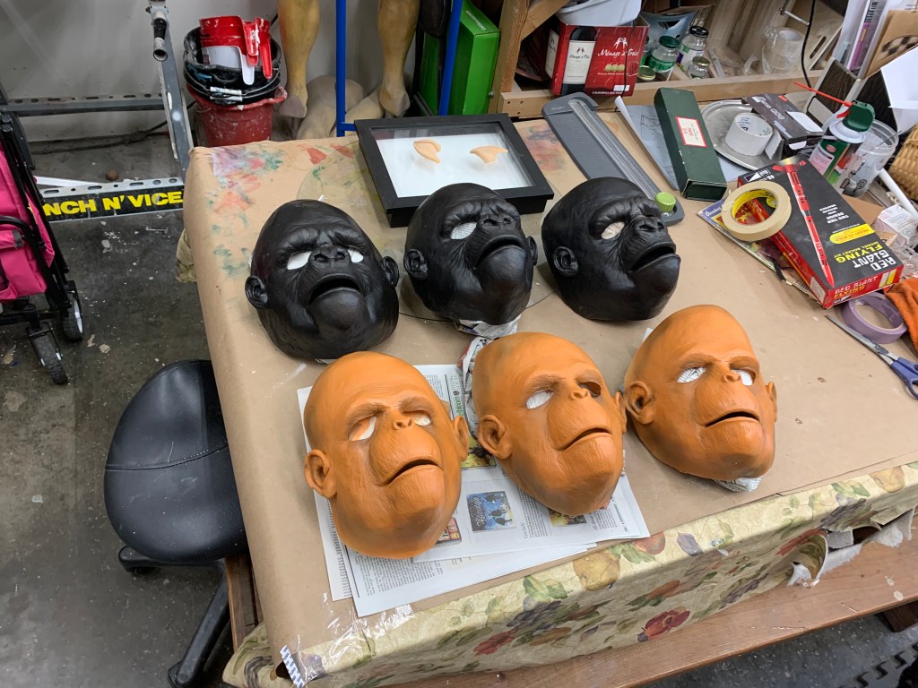 Yesterday I trimmed, patched , and painted the remaining mask orders. Today they will get their hair all except one Gorilla that the customer requested not have hair because he wants to do his own hair work.