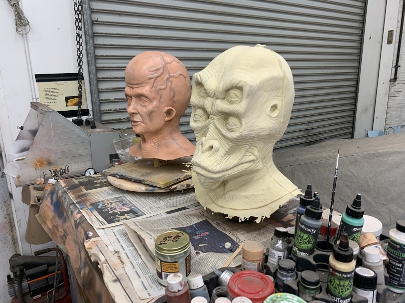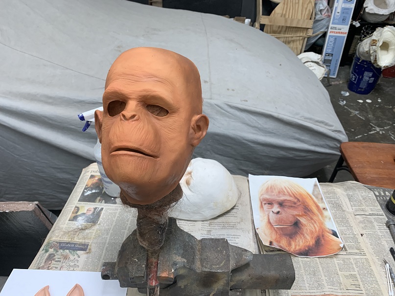 The masks are in various stages of completion. The Orangutan needs hair today. The Talosian needs its eyes painted and glazed.