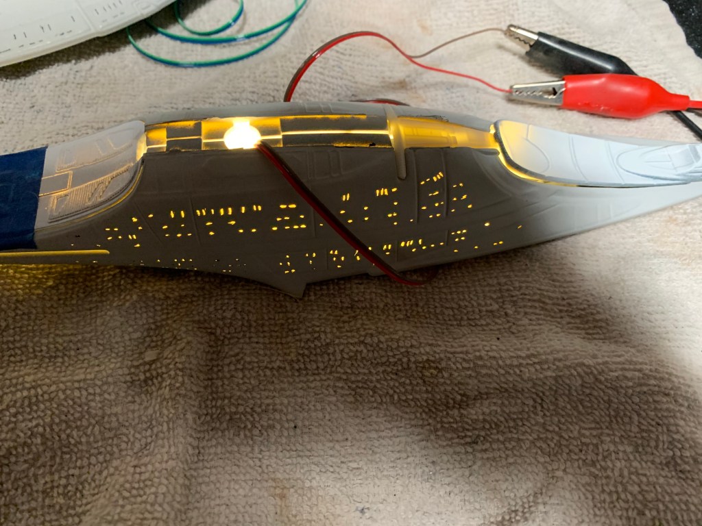 This means I can move on to things like lighting the nacelles and placing anti collision and NAV lights in the model. Close it all up and blocking the light leaks.