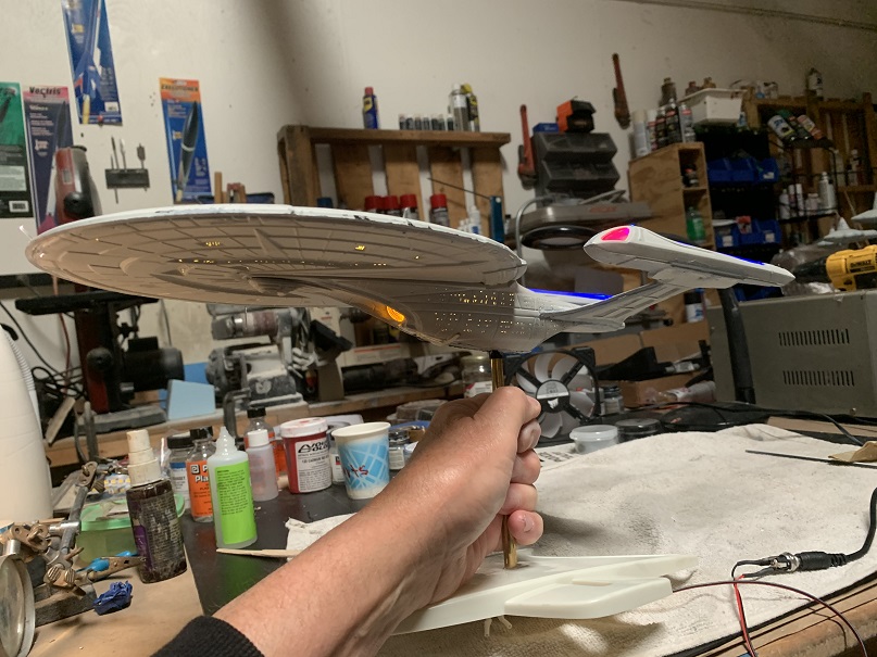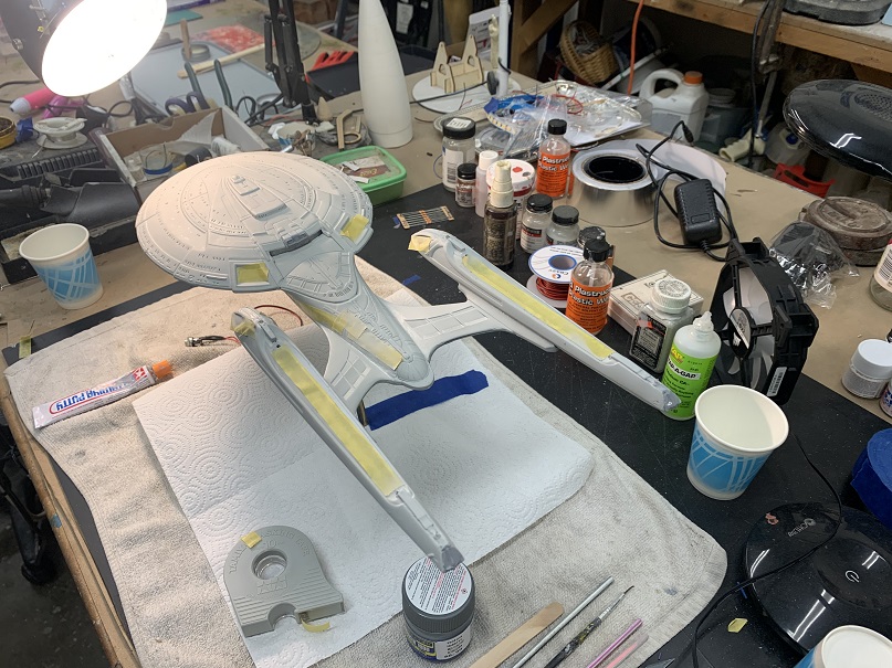 Yup, more model building. I’m working on meeting the June 14th deadline on the Enterprise E build and so far so good. I did manage this week to get her all buttoned up and ready for decals next week. There are a lot of decals that go on this model covering 90% of the hull. Currently all the clear parts and windows are covered to prevent over spray as I touch up the gaps and cracks followed by paint touch up.