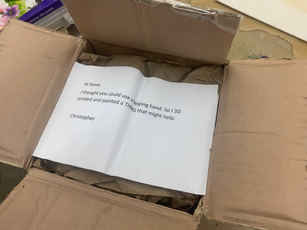 I noticed the return address and name right away. It was my long time friend and customer Christopher Hunt who I have built models for and masks for. From time to time he sends Mary and I wonder things at random in the mail.