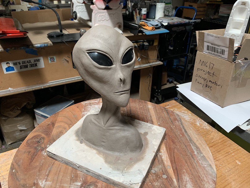 This is a wet clay sculpture and today I started the mold process. I won’t bore you with all the details but it’s complicated and will in the end yield a silicone mold that will enable me to make these out of long lasting polyurethane resin. It will be painted, the eyes glazed and mounted on a wooden base with a laser cut plaque. Signed by myself and Whitley Strieber.