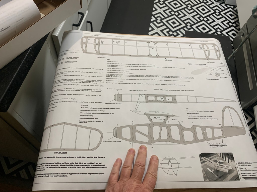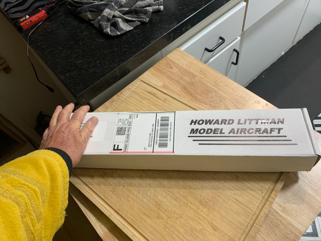 When I got home this package was waiting for me outside the door. A Howard Littman Model airplane. What a joy! Called the “Double Trouble” this little free flight model flies very well and will be a joy to build on my Birthday this weekend and fly with my friends at the Grassy Knoll. This is what it will look like when built.