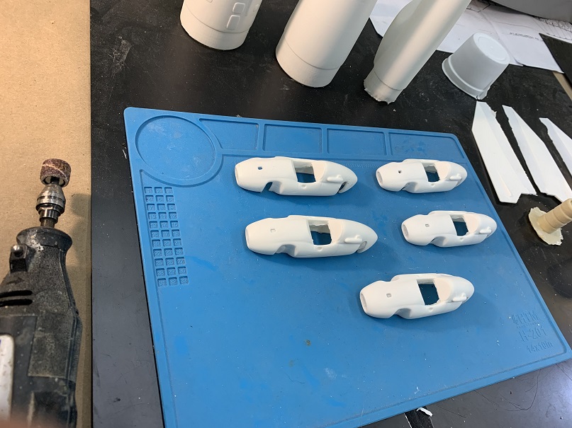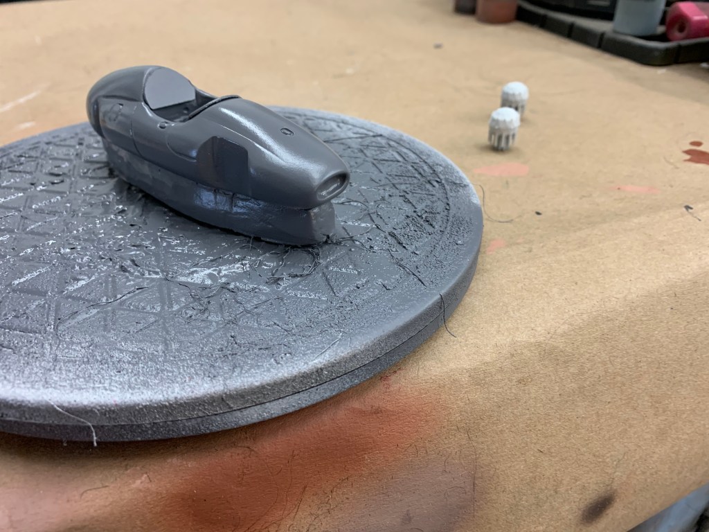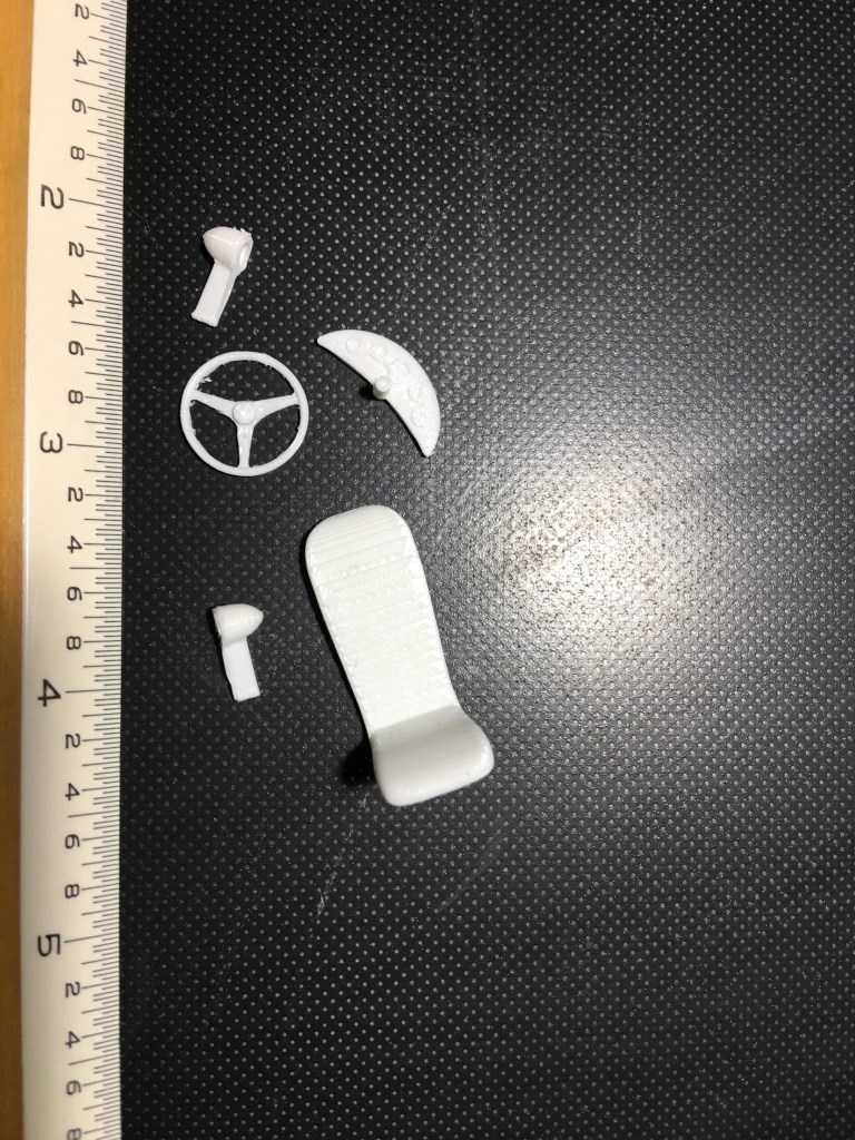 Body master is coming along well. Mark Helmick is 3D printing the steering wheel, seat, mirrors, dash and other small parts which will be cast in resin. This kit will also include water slide decals and PE brass parts.